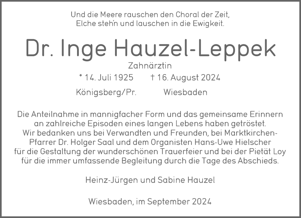 Hier finden Sie alle Traueranzeigen aus der Zeitung, die bisher für Inge Hauzel-Leppek erschienen sind. Weitere Traueranzeigen, die in der Zeitung erscheinen, werden hier ebenfalls aufgelistet