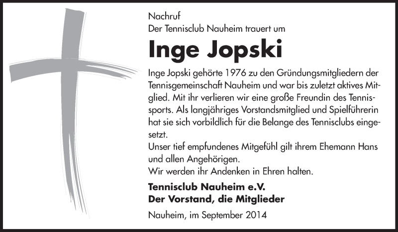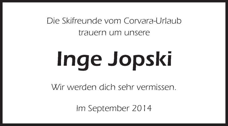 Hier finden Sie alle Traueranzeigen aus der Zeitung, die bisher für Inge Jopski erschienen sind. Weitere Traueranzeigen, die in der Zeitung erscheinen, werden hier ebenfalls aufgelistet