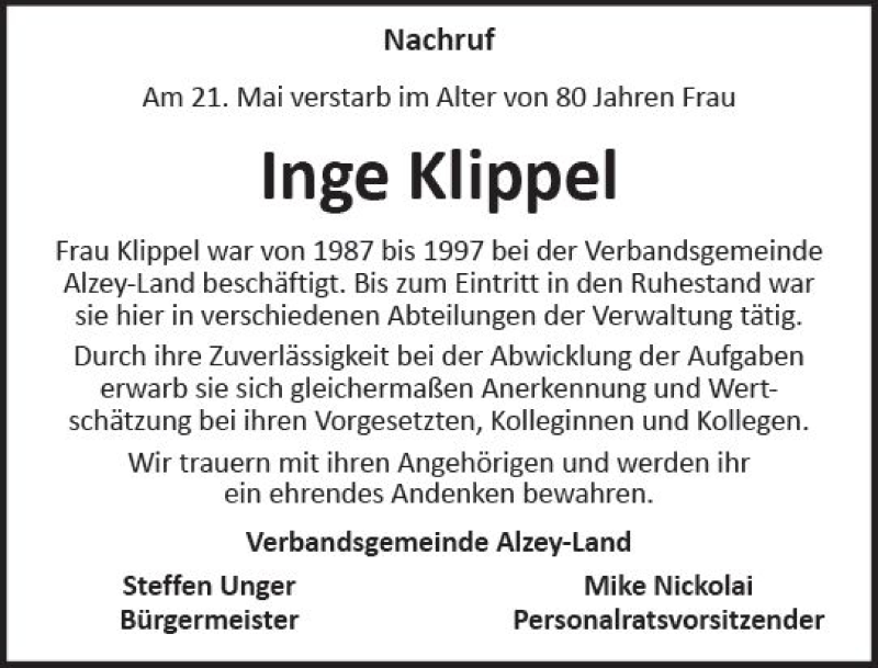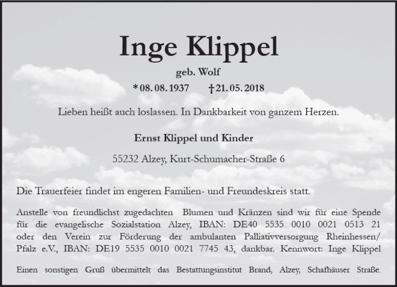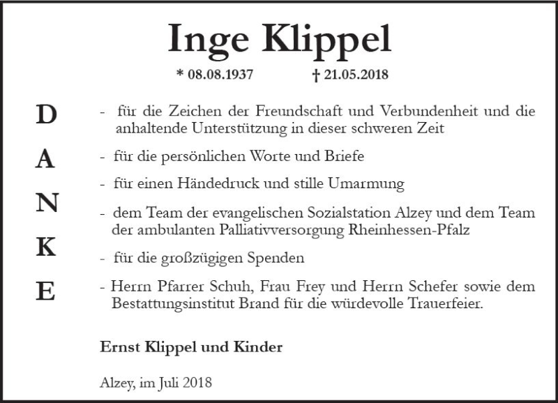 Hier finden Sie alle Traueranzeigen aus der Zeitung, die bisher für Inge Klippel erschienen sind. Weitere Traueranzeigen, die in der Zeitung erscheinen, werden hier ebenfalls aufgelistet