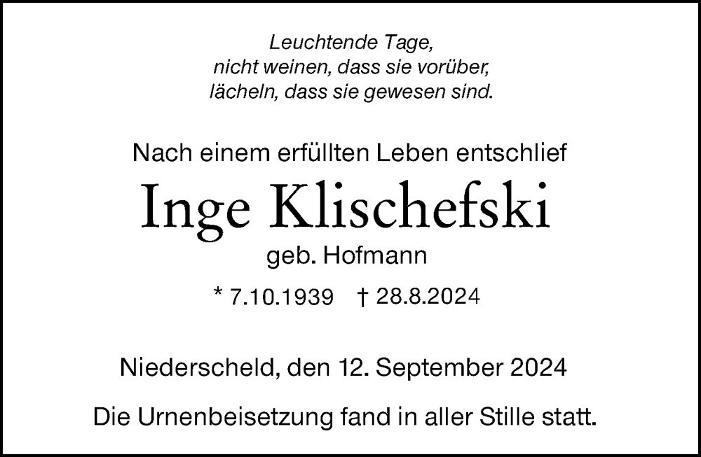 Hier finden Sie alle Traueranzeigen aus der Zeitung, die bisher für Inge Klischefski erschienen sind. Weitere Traueranzeigen, die in der Zeitung erscheinen, werden hier ebenfalls aufgelistet
