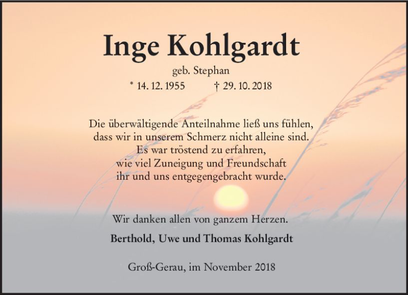Hier finden Sie alle Traueranzeigen aus der Zeitung, die bisher für Inge Kohlgardt erschienen sind. Weitere Traueranzeigen, die in der Zeitung erscheinen, werden hier ebenfalls aufgelistet