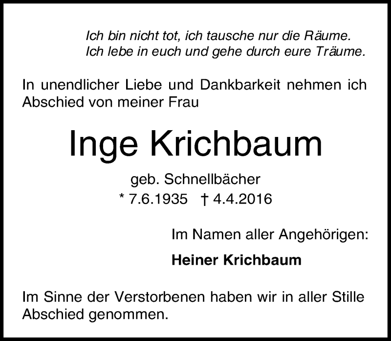 Hier finden Sie alle Traueranzeigen aus der Zeitung, die bisher für Inge Krichbaum erschienen sind. Weitere Traueranzeigen, die in der Zeitung erscheinen, werden hier ebenfalls aufgelistet