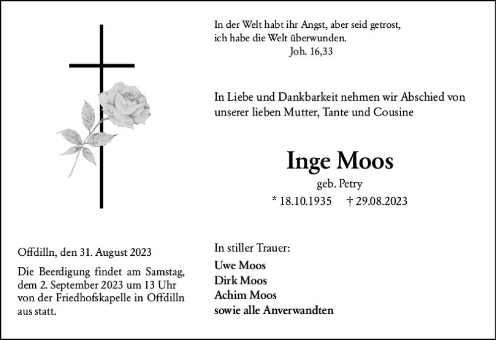 Hier finden Sie alle Traueranzeigen aus der Zeitung, die bisher für Inge Moos erschienen sind. Weitere Traueranzeigen, die in der Zeitung erscheinen, werden hier ebenfalls aufgelistet