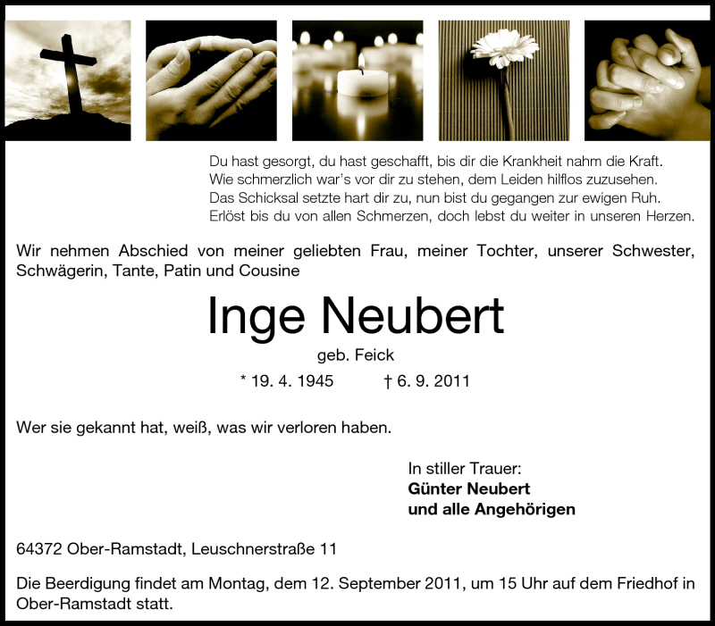 Hier finden Sie alle Traueranzeigen aus der Zeitung, die bisher für Inge Neubert erschienen sind. Weitere Traueranzeigen, die in der Zeitung erscheinen, werden hier ebenfalls aufgelistet