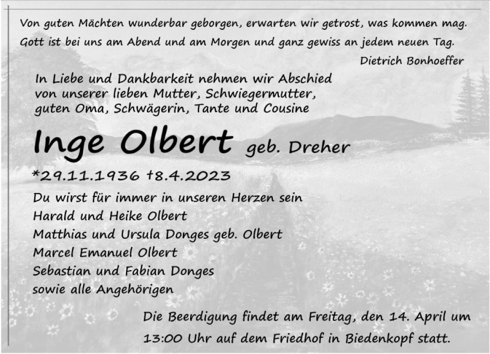 Hier finden Sie alle Traueranzeigen aus der Zeitung, die bisher für Inge Olbert erschienen sind. Weitere Traueranzeigen, die in der Zeitung erscheinen, werden hier ebenfalls aufgelistet