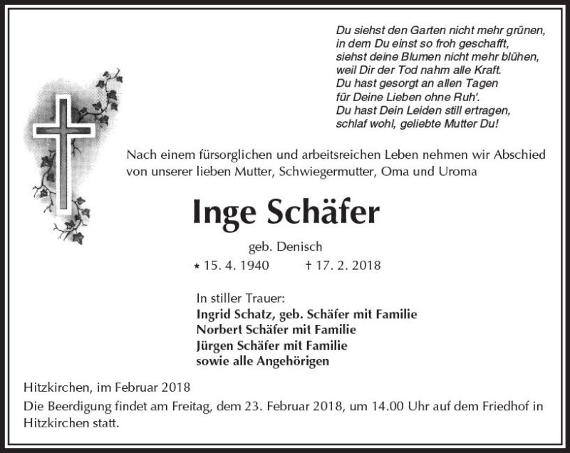 Hier finden Sie alle Traueranzeigen aus der Zeitung, die bisher für Inge Schäfer erschienen sind. Weitere Traueranzeigen, die in der Zeitung erscheinen, werden hier ebenfalls aufgelistet