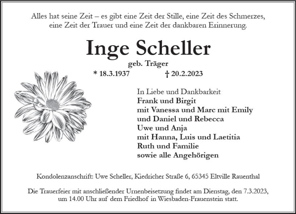 Hier finden Sie alle Traueranzeigen aus der Zeitung, die bisher für Inge Scheller erschienen sind. Weitere Traueranzeigen, die in der Zeitung erscheinen, werden hier ebenfalls aufgelistet