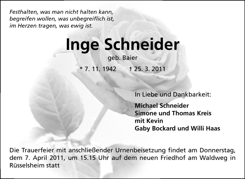 Hier finden Sie alle Traueranzeigen aus der Zeitung, die bisher für Inge Schneider erschienen sind. Weitere Traueranzeigen, die in der Zeitung erscheinen, werden hier ebenfalls aufgelistet
