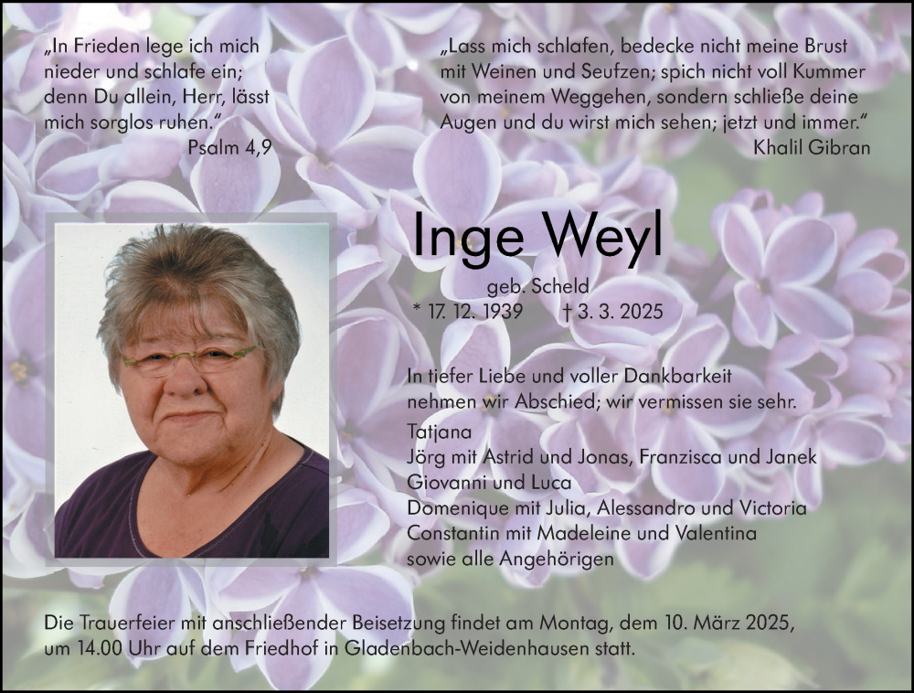 Hier finden Sie alle Traueranzeigen aus der Zeitung, die bisher für Inge Weyl erschienen sind. Weitere Traueranzeigen, die in der Zeitung erscheinen, werden hier ebenfalls aufgelistet