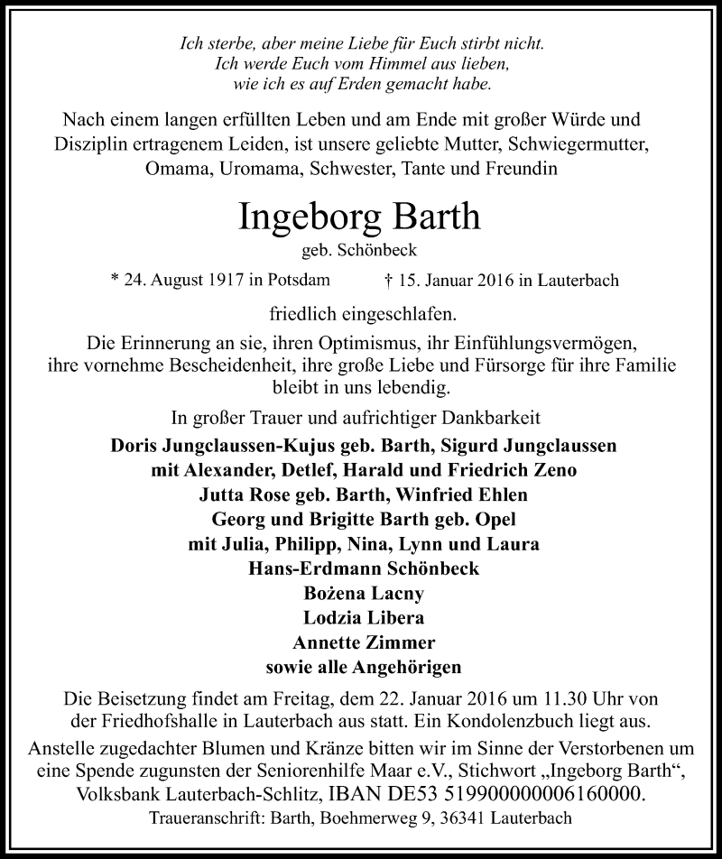 Hier finden Sie alle Traueranzeigen aus der Zeitung, die bisher für Ingeborg Barth erschienen sind. Weitere Traueranzeigen, die in der Zeitung erscheinen, werden hier ebenfalls aufgelistet