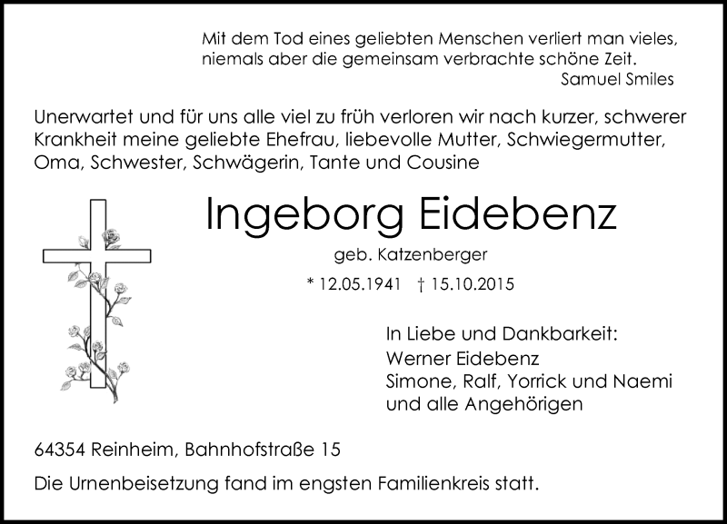 Hier finden Sie alle Traueranzeigen aus der Zeitung, die bisher für Ingeborg Eidebenz erschienen sind. Weitere Traueranzeigen, die in der Zeitung erscheinen, werden hier ebenfalls aufgelistet