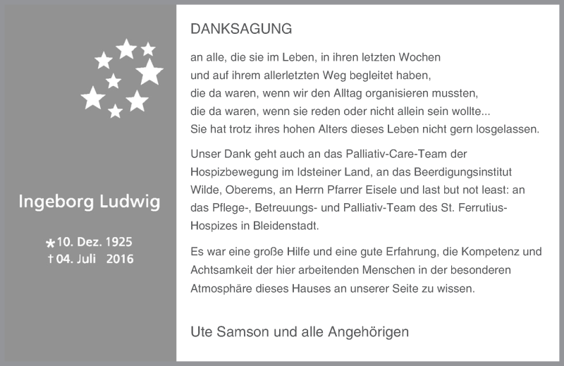 Hier finden Sie alle Traueranzeigen aus der Zeitung, die bisher für Ingeborg Ludwig erschienen sind. Weitere Traueranzeigen, die in der Zeitung erscheinen, werden hier ebenfalls aufgelistet