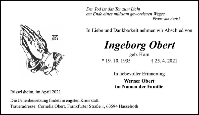 Hier finden Sie alle Traueranzeigen aus der Zeitung, die bisher für Ingeborg Obert erschienen sind. Weitere Traueranzeigen, die in der Zeitung erscheinen, werden hier ebenfalls aufgelistet