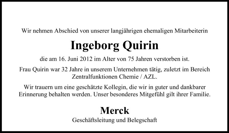 Hier finden Sie alle Traueranzeigen aus der Zeitung, die bisher für Ingeborg Quirin erschienen sind. Weitere Traueranzeigen, die in der Zeitung erscheinen, werden hier ebenfalls aufgelistet