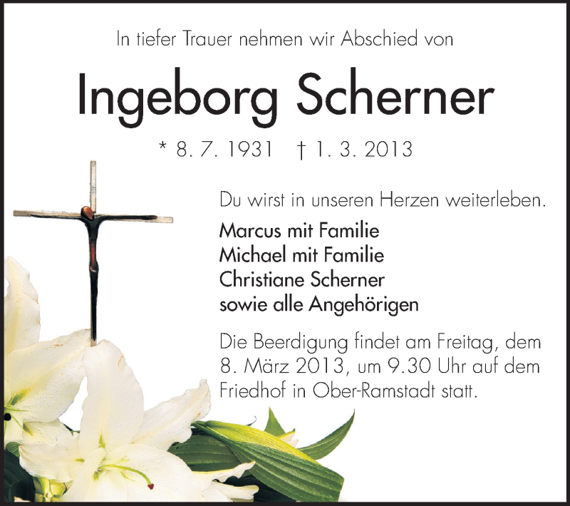 Hier finden Sie alle Traueranzeigen aus der Zeitung, die bisher für Ingeborg Scherner erschienen sind. Weitere Traueranzeigen, die in der Zeitung erscheinen, werden hier ebenfalls aufgelistet
