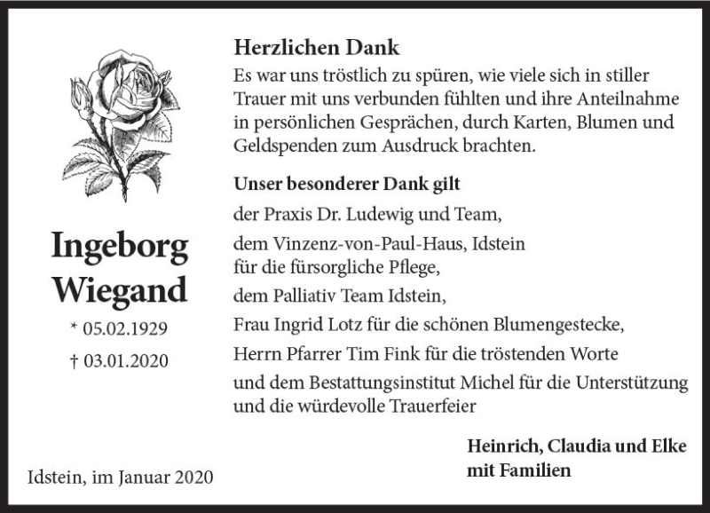 Hier finden Sie alle Traueranzeigen aus der Zeitung, die bisher für Ingeborg Wiegand erschienen sind. Weitere Traueranzeigen, die in der Zeitung erscheinen, werden hier ebenfalls aufgelistet