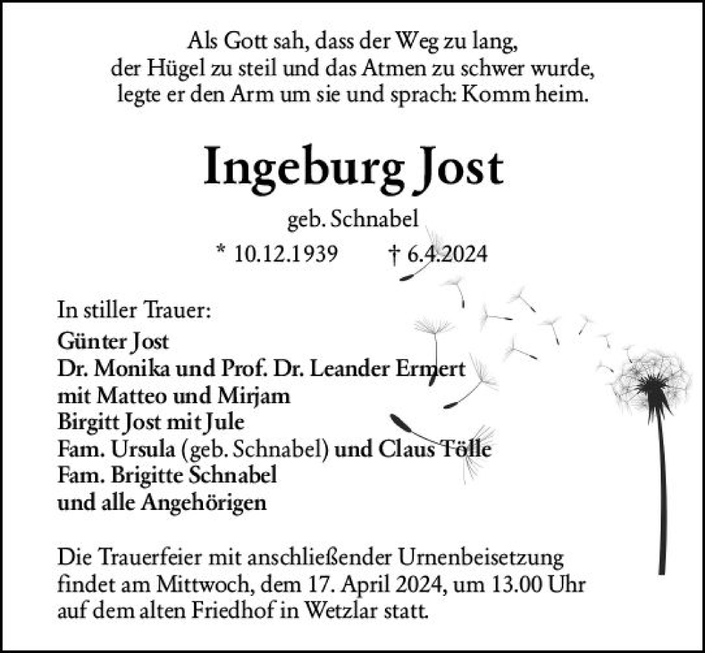Hier finden Sie alle Traueranzeigen aus der Zeitung, die bisher für Ingeburg Jost erschienen sind. Weitere Traueranzeigen, die in der Zeitung erscheinen, werden hier ebenfalls aufgelistet