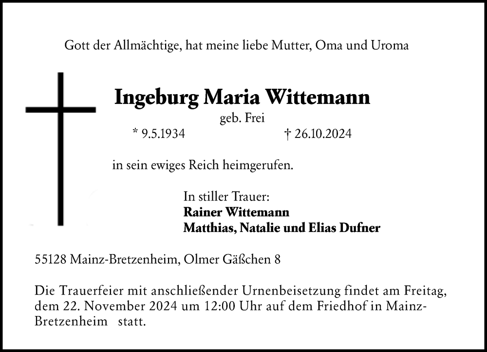 Hier finden Sie alle Traueranzeigen aus der Zeitung, die bisher für Ingeburg Maria Wittemann erschienen sind. Weitere Traueranzeigen, die in der Zeitung erscheinen, werden hier ebenfalls aufgelistet