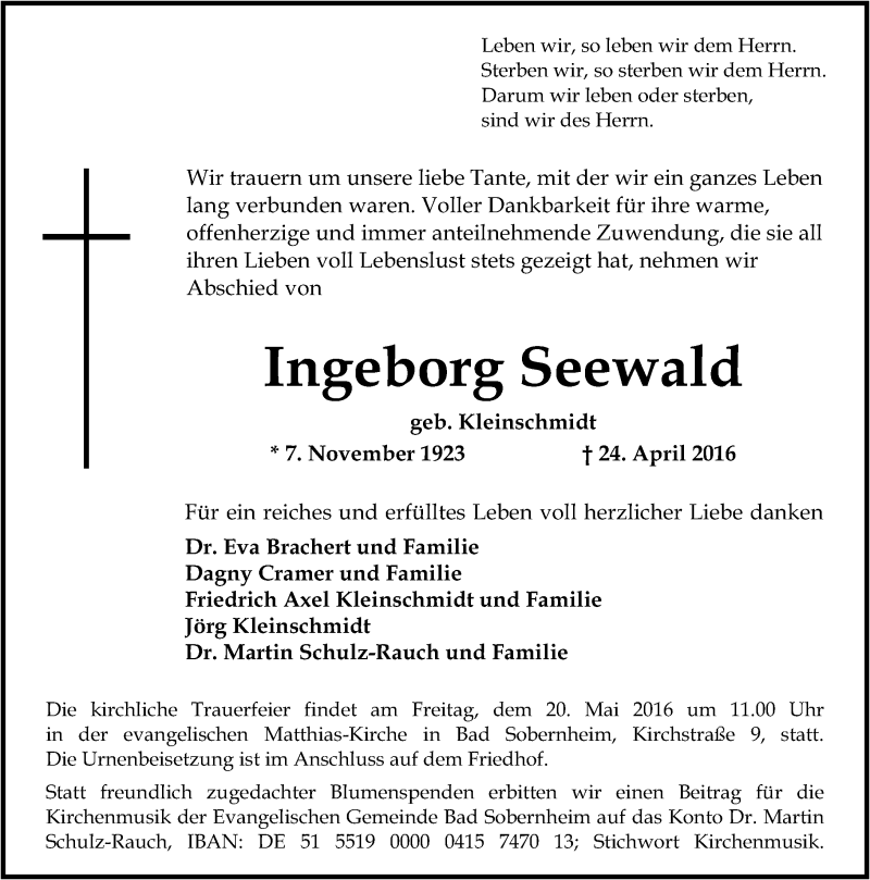 Hier finden Sie alle Traueranzeigen aus der Zeitung, die bisher für Ingeburg Seewald erschienen sind. Weitere Traueranzeigen, die in der Zeitung erscheinen, werden hier ebenfalls aufgelistet