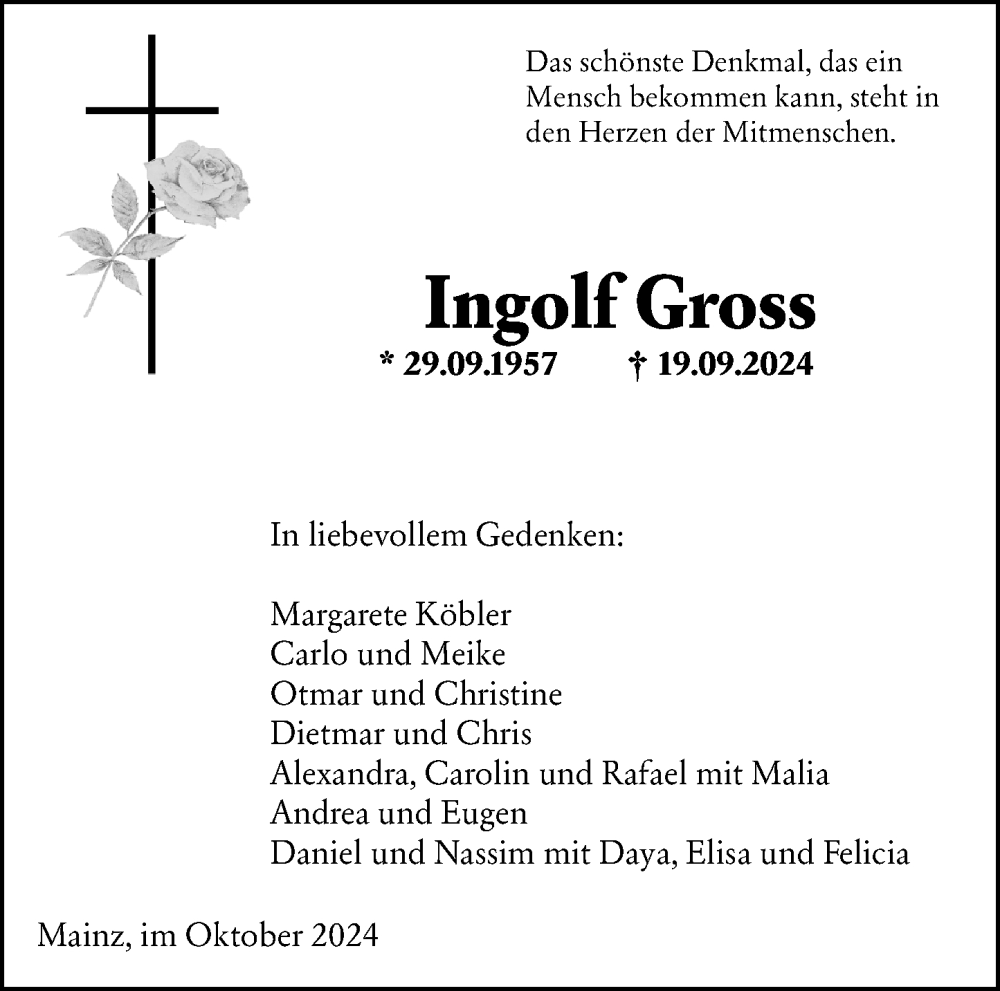Hier finden Sie alle Traueranzeigen aus der Zeitung, die bisher für Ingolf Gross erschienen sind. Weitere Traueranzeigen, die in der Zeitung erscheinen, werden hier ebenfalls aufgelistet