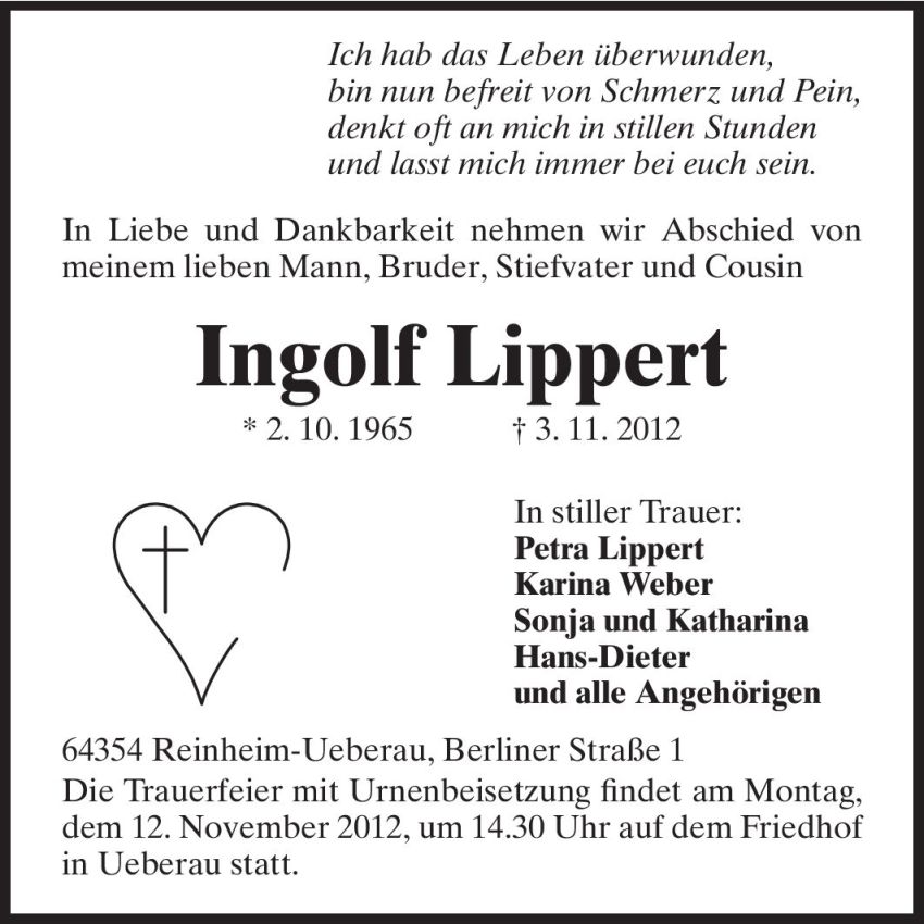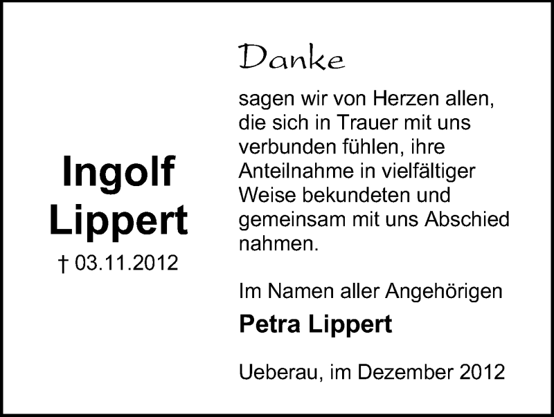 Hier finden Sie alle Traueranzeigen aus der Zeitung, die bisher für Ingolf Lippert erschienen sind. Weitere Traueranzeigen, die in der Zeitung erscheinen, werden hier ebenfalls aufgelistet