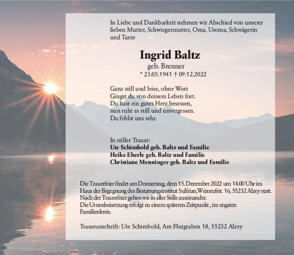 Hier finden Sie alle Traueranzeigen aus der Zeitung, die bisher für Ingrid Balle erschienen sind. Weitere Traueranzeigen, die in der Zeitung erscheinen, werden hier ebenfalls aufgelistet