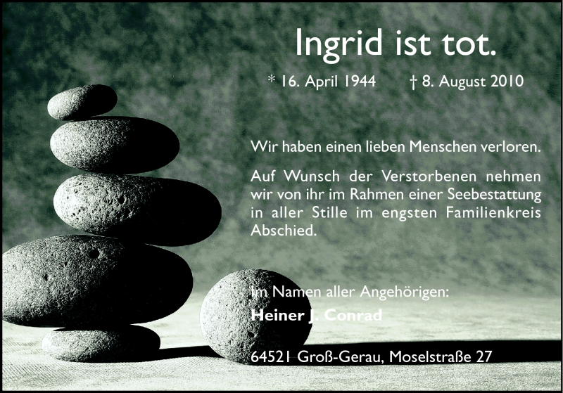 Hier finden Sie alle Traueranzeigen aus der Zeitung, die bisher für Ingrid Conrad erschienen sind. Weitere Traueranzeigen, die in der Zeitung erscheinen, werden hier ebenfalls aufgelistet