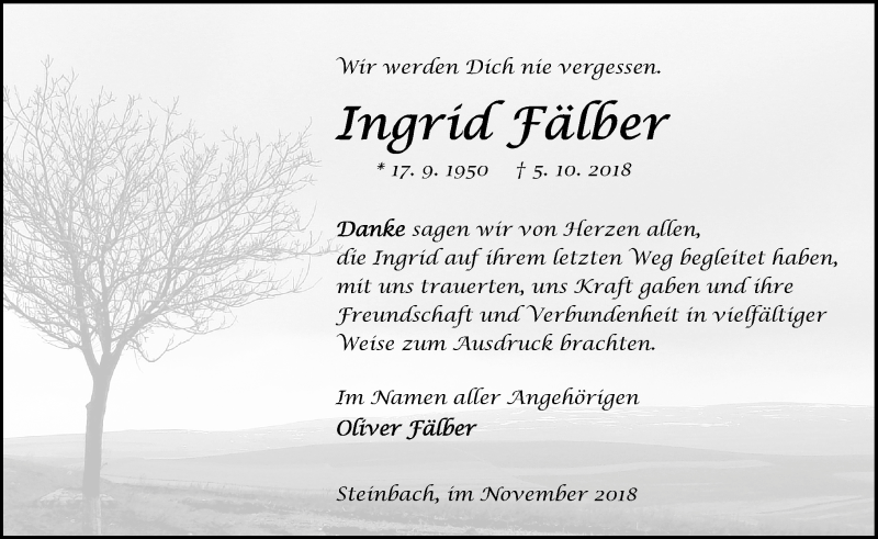 Hier finden Sie alle Traueranzeigen aus der Zeitung, die bisher für Ingrid Fälber erschienen sind. Weitere Traueranzeigen, die in der Zeitung erscheinen, werden hier ebenfalls aufgelistet