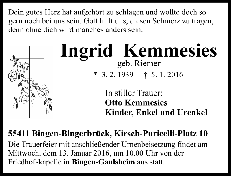 Hier finden Sie alle Traueranzeigen aus der Zeitung, die bisher für Ingrid Kemmesies erschienen sind. Weitere Traueranzeigen, die in der Zeitung erscheinen, werden hier ebenfalls aufgelistet