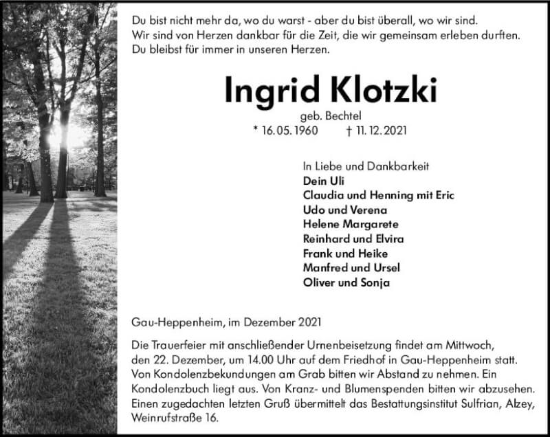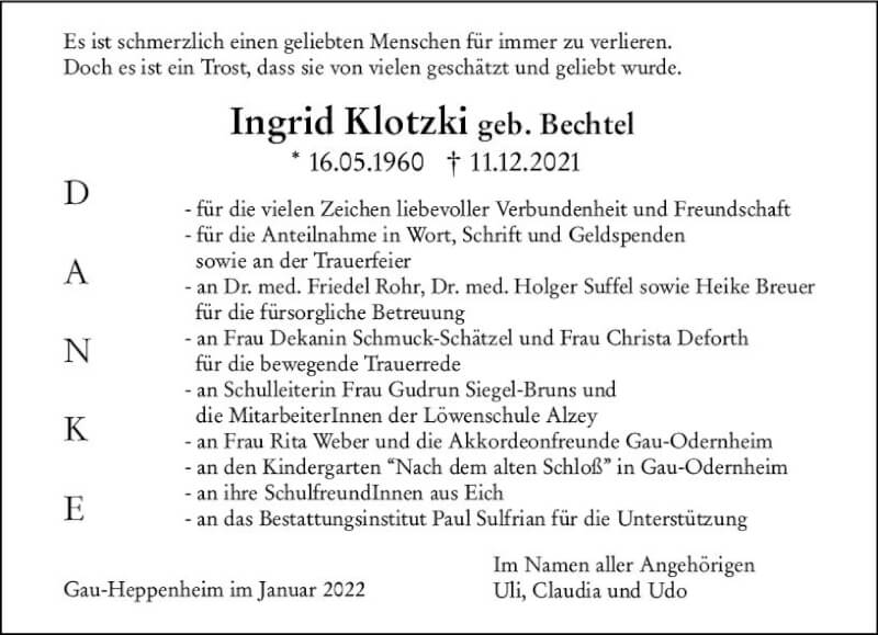 Hier finden Sie alle Traueranzeigen aus der Zeitung, die bisher für Ingrid Klotzki erschienen sind. Weitere Traueranzeigen, die in der Zeitung erscheinen, werden hier ebenfalls aufgelistet