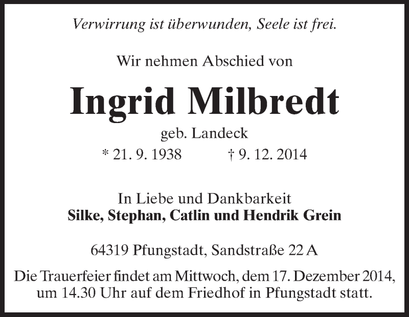 Hier finden Sie alle Traueranzeigen aus der Zeitung, die bisher für Ingrid Milbredt erschienen sind. Weitere Traueranzeigen, die in der Zeitung erscheinen, werden hier ebenfalls aufgelistet