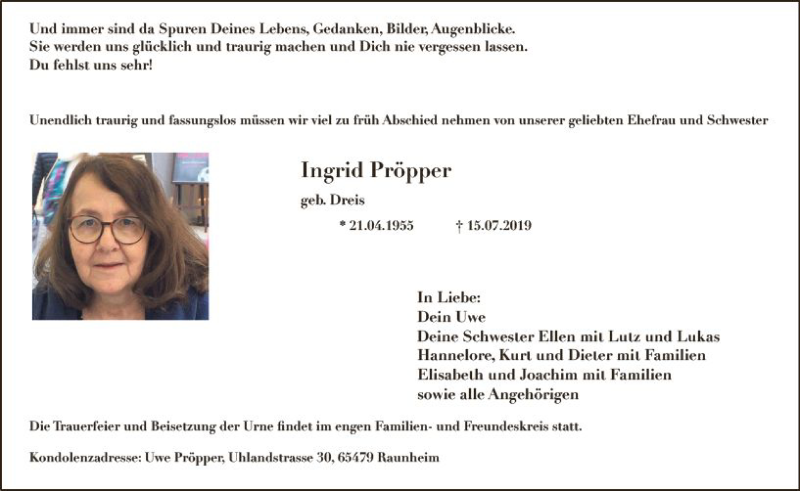Hier finden Sie alle Traueranzeigen aus der Zeitung, die bisher für Ingrid Pröpper erschienen sind. Weitere Traueranzeigen, die in der Zeitung erscheinen, werden hier ebenfalls aufgelistet