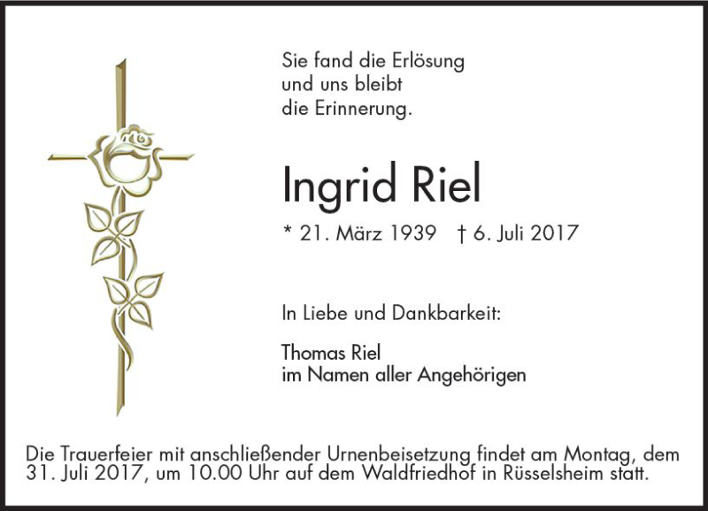 Hier finden Sie alle Traueranzeigen aus der Zeitung, die bisher für Ingrid Riel erschienen sind. Weitere Traueranzeigen, die in der Zeitung erscheinen, werden hier ebenfalls aufgelistet