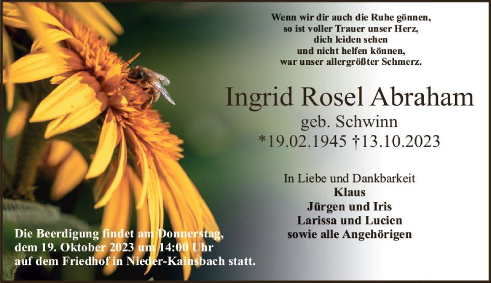 Hier finden Sie alle Traueranzeigen aus der Zeitung, die bisher für Ingrid Rosel Abraham erschienen sind. Weitere Traueranzeigen, die in der Zeitung erscheinen, werden hier ebenfalls aufgelistet