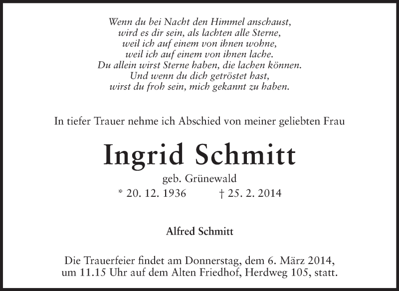 Hier finden Sie alle Traueranzeigen aus der Zeitung, die bisher für Ingrid Schmitt erschienen sind. Weitere Traueranzeigen, die in der Zeitung erscheinen, werden hier ebenfalls aufgelistet