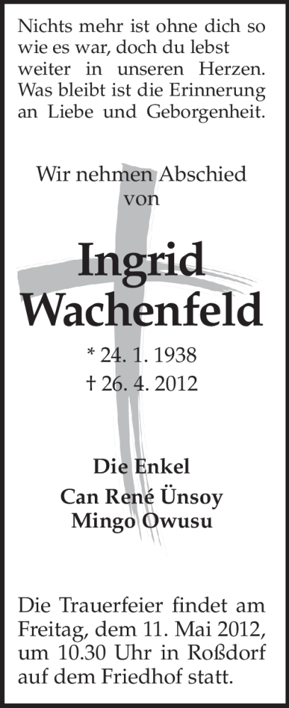 Hier finden Sie alle Traueranzeigen aus der Zeitung, die bisher für Ingrid Wachenfeld erschienen sind. Weitere Traueranzeigen, die in der Zeitung erscheinen, werden hier ebenfalls aufgelistet