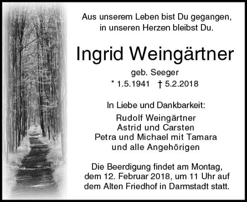 Hier finden Sie alle Traueranzeigen aus der Zeitung, die bisher für Ingrid Weingärtner erschienen sind. Weitere Traueranzeigen, die in der Zeitung erscheinen, werden hier ebenfalls aufgelistet