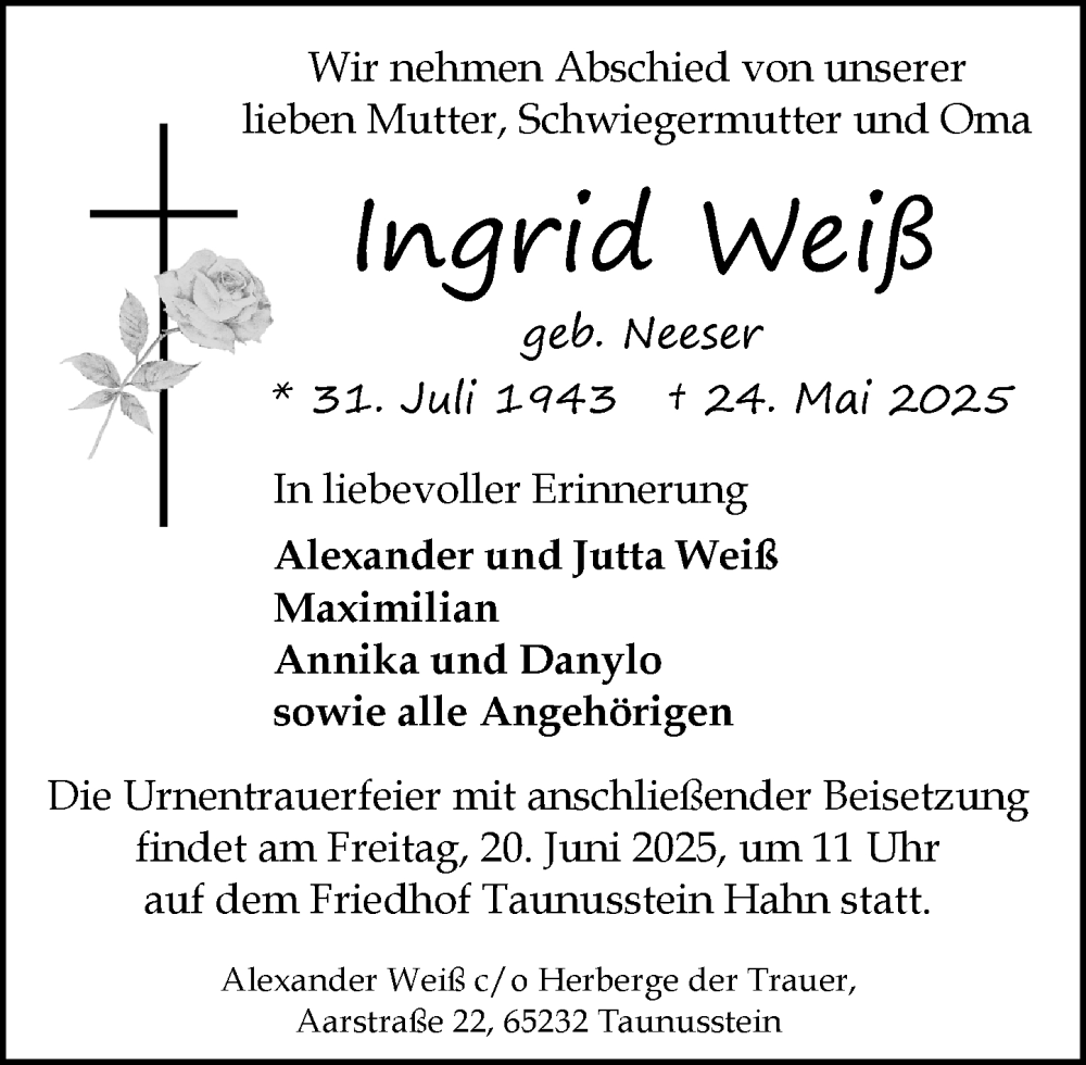 Hier finden Sie alle Traueranzeigen aus der Zeitung, die bisher für Ingrid Weiß erschienen sind. Weitere Traueranzeigen, die in der Zeitung erscheinen, werden hier ebenfalls aufgelistet