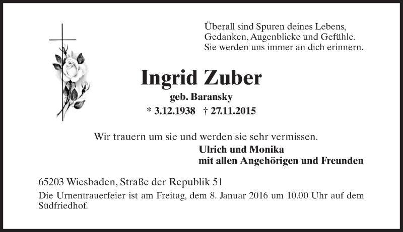 Hier finden Sie alle Traueranzeigen aus der Zeitung, die bisher für Ingrid Zuber erschienen sind. Weitere Traueranzeigen, die in der Zeitung erscheinen, werden hier ebenfalls aufgelistet