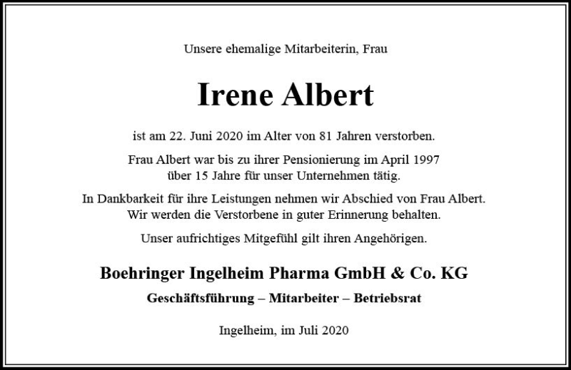 Hier finden Sie alle Traueranzeigen aus der Zeitung, die bisher für Irene Albert erschienen sind. Weitere Traueranzeigen, die in der Zeitung erscheinen, werden hier ebenfalls aufgelistet