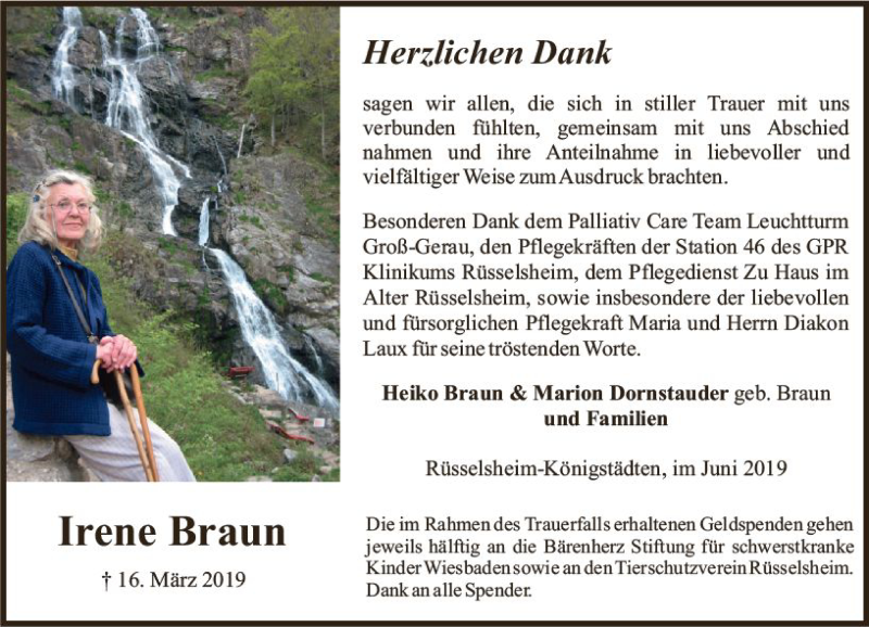 Hier finden Sie alle Traueranzeigen aus der Zeitung, die bisher für Irene Braun erschienen sind. Weitere Traueranzeigen, die in der Zeitung erscheinen, werden hier ebenfalls aufgelistet