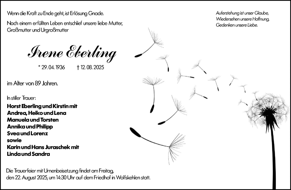 Hier finden Sie alle Traueranzeigen aus der Zeitung, die bisher für Irene Eberling erschienen sind. Weitere Traueranzeigen, die in der Zeitung erscheinen, werden hier ebenfalls aufgelistet
