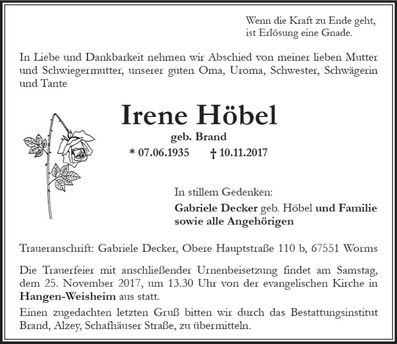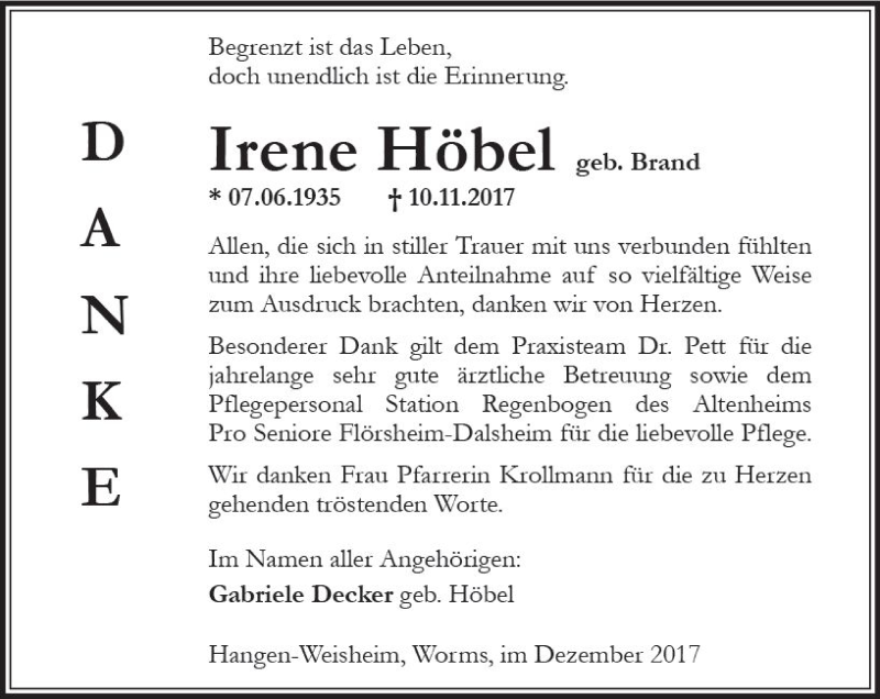 Hier finden Sie alle Traueranzeigen aus der Zeitung, die bisher für Irene Höbel erschienen sind. Weitere Traueranzeigen, die in der Zeitung erscheinen, werden hier ebenfalls aufgelistet