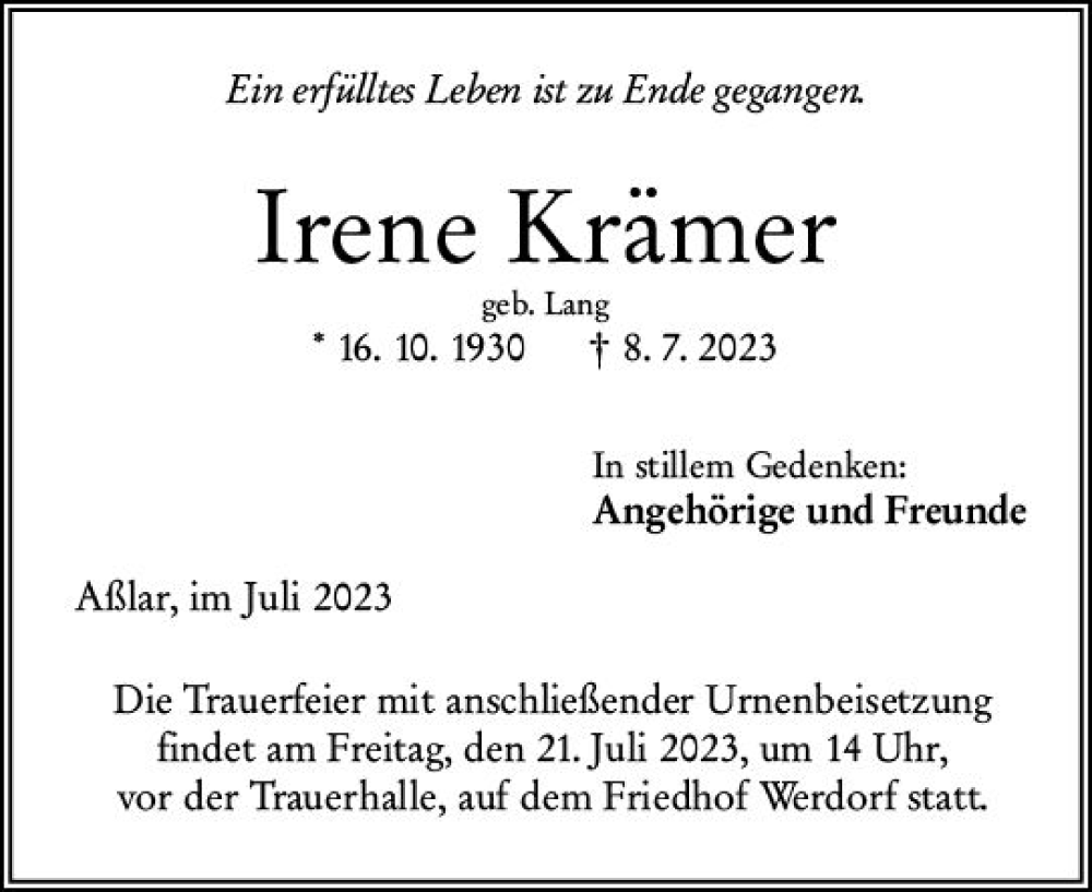 Hier finden Sie alle Traueranzeigen aus der Zeitung, die bisher für Irene Krämer erschienen sind. Weitere Traueranzeigen, die in der Zeitung erscheinen, werden hier ebenfalls aufgelistet