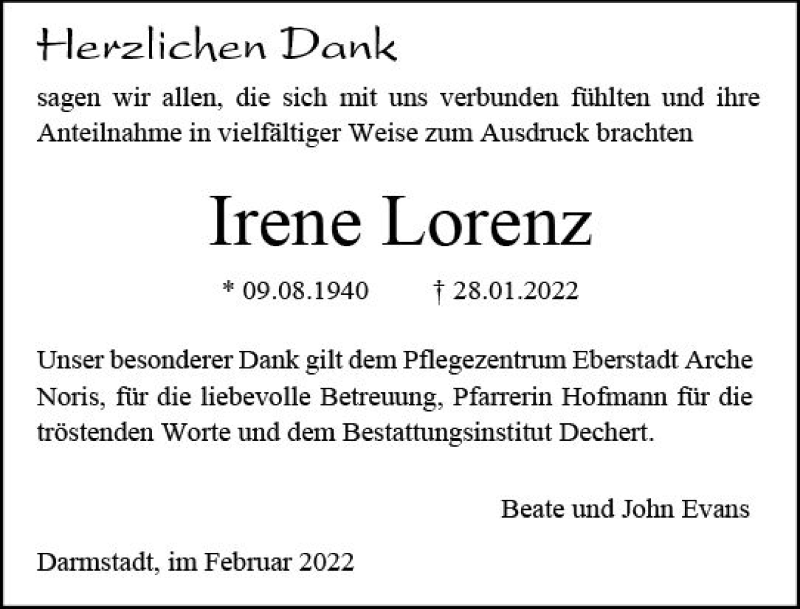 Hier finden Sie alle Traueranzeigen aus der Zeitung, die bisher für Irene Lorenz erschienen sind. Weitere Traueranzeigen, die in der Zeitung erscheinen, werden hier ebenfalls aufgelistet