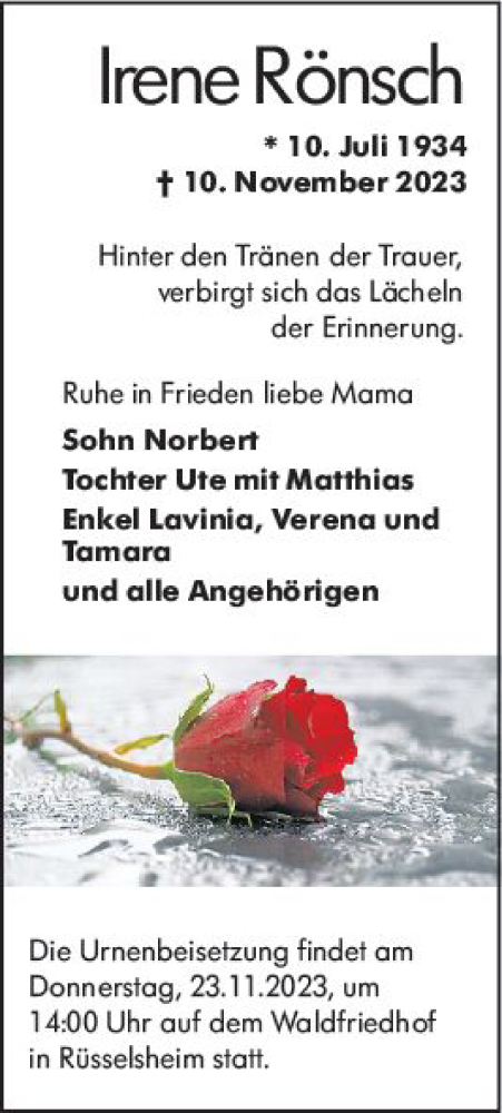 Hier finden Sie alle Traueranzeigen aus der Zeitung, die bisher für Irene Rönsch erschienen sind. Weitere Traueranzeigen, die in der Zeitung erscheinen, werden hier ebenfalls aufgelistet