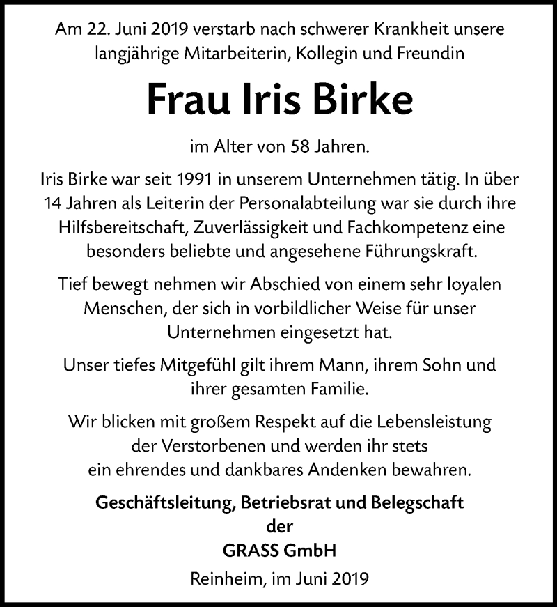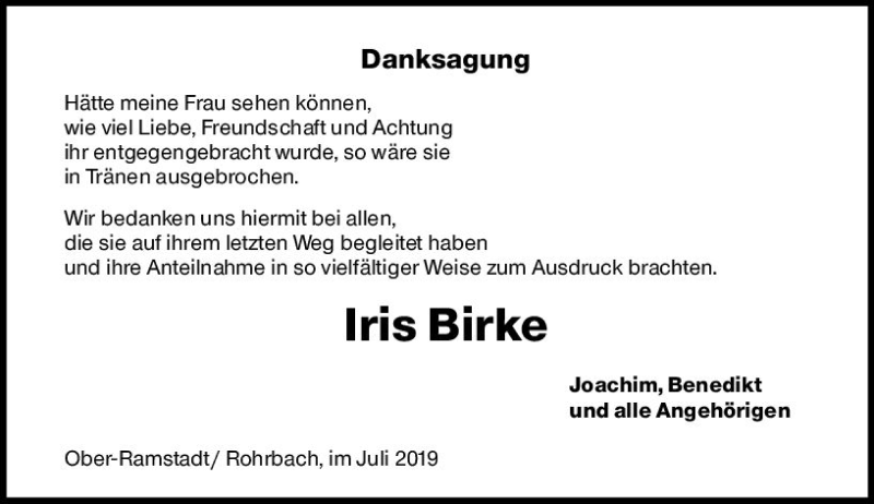 Hier finden Sie alle Traueranzeigen aus der Zeitung, die bisher für Iris Birke erschienen sind. Weitere Traueranzeigen, die in der Zeitung erscheinen, werden hier ebenfalls aufgelistet