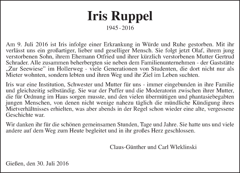 Hier finden Sie alle Traueranzeigen aus der Zeitung, die bisher für Iris Ruppel erschienen sind. Weitere Traueranzeigen, die in der Zeitung erscheinen, werden hier ebenfalls aufgelistet