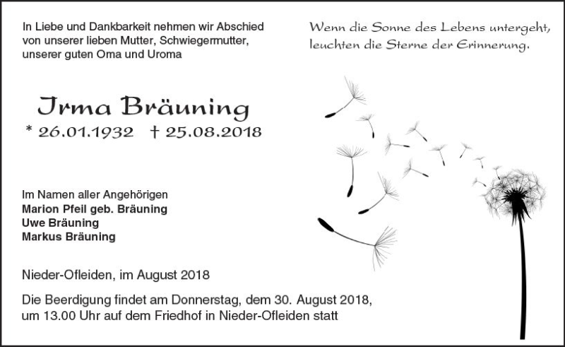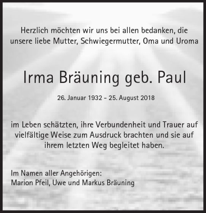 Hier finden Sie alle Traueranzeigen aus der Zeitung, die bisher für Irma Bräuning erschienen sind. Weitere Traueranzeigen, die in der Zeitung erscheinen, werden hier ebenfalls aufgelistet