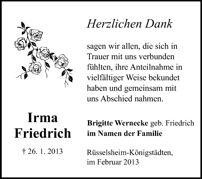 Hier finden Sie alle Traueranzeigen aus der Zeitung, die bisher für Irma Friedrich erschienen sind. Weitere Traueranzeigen, die in der Zeitung erscheinen, werden hier ebenfalls aufgelistet